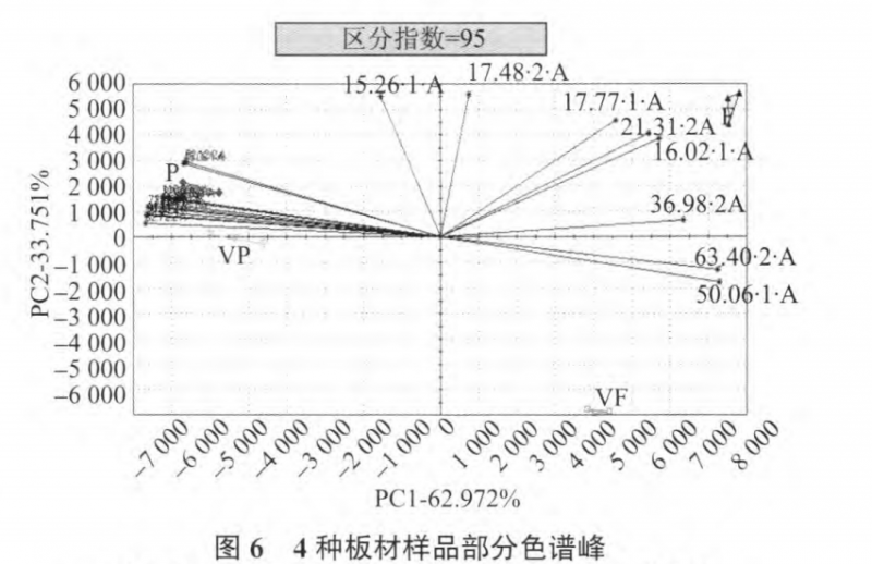 通過篩選峰面積較大(峰面積>l ooo)及樣品分較為明顯(區(qū)別能力>0.9)色譜峰優(yōu)化試驗(yàn)結(jié)果見圖6,且標(biāo)注出貢獻(xiàn)區(qū)分的主要色譜峰。圖5與圖6無明顯差異,4種樣品分布趨勢(shì)相同,刨花板與貼面刨花板距離較為接近,纖維板與貼面纖維板的距離較遠(yuǎn)。