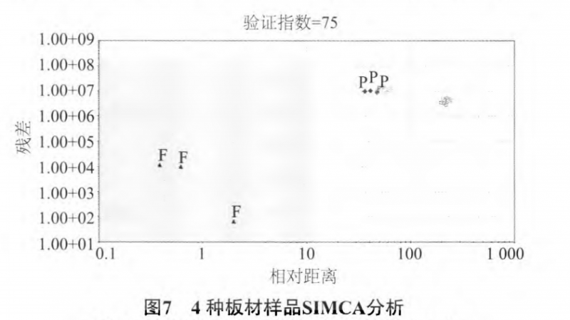 圖8為以纖維板F為控制樣,建立板材樣品的SQC 分析圖。由圖中可知,纖維板F分布在控制區(qū)域內(nèi),其他3種板材樣品則分布在控制區(qū)域外。與SIMCA分析的效果一樣,都可以對(duì)產(chǎn)品質(zhì)檢品控和板材種類辨別分析提供參考和幫助。