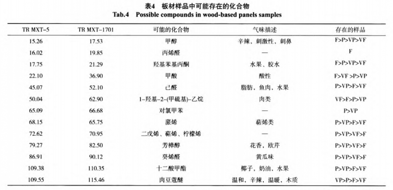 采用AroChembase數(shù)據(jù)庫對(duì)板材樣品中的揮發(fā)性化合物進(jìn)行定性,可能含有的化合物見表4。