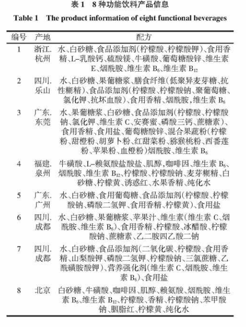 8 種功能飲料均為市售,其編號(hào)、品牌、廠家、產(chǎn)地及配方見表1。