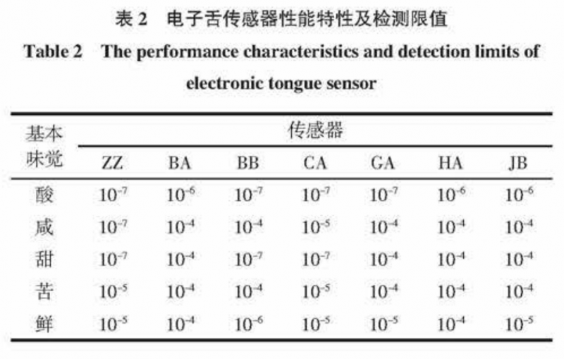 儀器:ASTREE型電子舌,法國(guó) AlphaMOS公司,該電子舌由 7 根非專一性和一個(gè)Ag/AgCl參比電極組成,每根傳感器對(duì)酸、甜、苦和鮮味敏感程度不一樣,其傳感器特性及檢測(cè)限值見表 2。