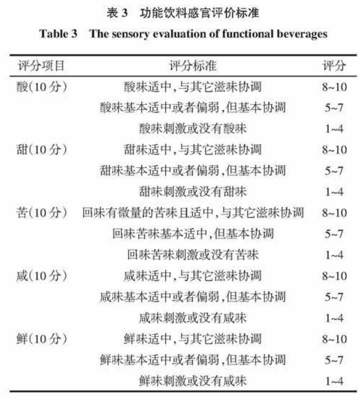 食品的感官分為外觀、香味、特性 4 個(gè)方面,試驗(yàn)僅以滋味品質(zhì)為參考,10 名以上受過專業(yè)培訓(xùn)的官評(píng)價(jià)人員對(duì) 8 種功能飲料進(jìn)行評(píng)分,其評(píng)分標(biāo)準(zhǔn)見表 3