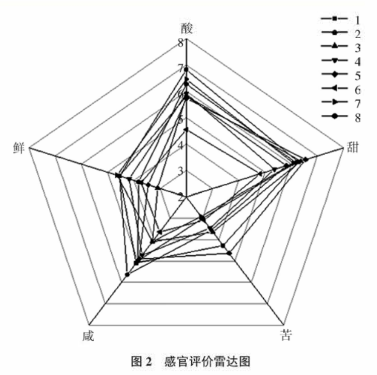 在本研究中,感官評(píng)價(jià)及電子舌對(duì) 6、7、8 號(hào)樣品的分組存在差異,并且電子舌不存在與酸味品質(zhì)顯著相關(guān)的探頭。針對(duì)上述問題,可能原因是:1相對(duì)于電子舌,感官評(píng)價(jià)受環(huán)境及人為因素影響較大,其結(jié)果存在較大的波動(dòng);2 食品中滋味的形成不僅與呈味物質(zhì)種類(氨基酸、多肽類、核苷酸、還原糖等)有關(guān),還受呈味機(jī)制(相乘作用、遮蔽作用、消殺作用等)的影響。試驗(yàn)采用非專一性的電子舌探頭,該類探頭是根據(jù)呈味物質(zhì)建立的模型來預(yù)測(cè)樣品滋味相對(duì)強(qiáng)度,但對(duì)于單一滋味,其預(yù)測(cè)效果可能不太理想,使探頭與某些重要的滋味品質(zhì)的相關(guān)性不顯著。