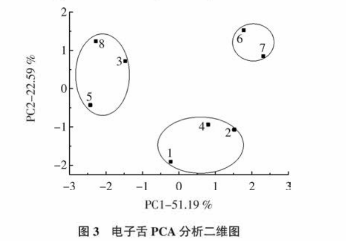 主成分 1、2 的貢獻(xiàn)度分別為48.29 % 、28.65 %,累計(jì)方差貢獻(xiàn)度為 76.94 % , 基本上上包含了樣品的大部分信息,從其二維圖上看,8 個(gè)樣品分 3 類:1、2、4、7、8為第一組;3、5為第二組;6為第三組。綜上所述,8 種功能飲料按電子舌與感官評(píng)價(jià)的差異可獲得較為一致的分組效果:1、2、4為第一組 ;3、5為第二組; 6 為第三組,但 7、8號(hào)樣品的分類存在差異。王俊魁等在采用感官評(píng)價(jià)和電子舌區(qū)分不同品牌韭菜花醬時(shí),認(rèn)為兩種方法對(duì)韭菜花醬滋味品質(zhì)區(qū)分效果相似,這與本文結(jié)論基本一致。