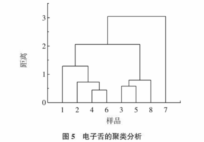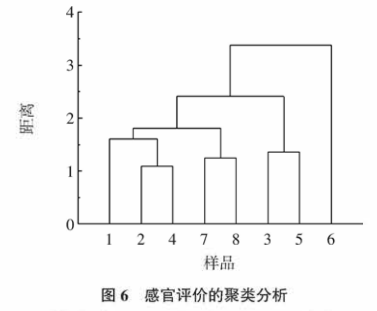 由圖5 和圖 6 可知:若以電子舌指標(biāo)為參考,當(dāng)距離為 1.28 時(shí) ,可將 8 種能飲料分 為 3 類,分組情況如 1、2、4、6為第一組,3、5、8為第二組,7 為第三組,這與主成分分析結(jié)果基本一致,僅 6 號(hào)樣品分組情況無法確定。若以感官指標(biāo)為參考,距離為 2 時(shí),可將8 種功能飲料分為3類,分組情如下:1、2、4、7、8 為第一組,3、5為第二組,6 為第三組,這與感官評(píng)價(jià)主成分分析結(jié)果一致。綜上所述 ,采用聚類分析,8 種功能飲料按電子舌與感官評(píng)價(jià)差異可獲得較為一致的分組 :1、2、4為 第一組,3、5為第二組,但 6 、7、8號(hào)樣品分組情況有差異。