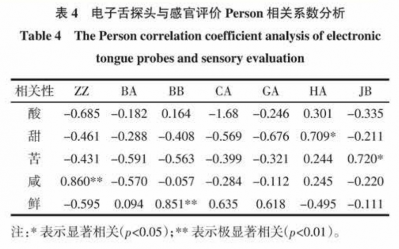 研究對(duì) 8 種不同品牌能飲料的滋味品質(zhì)進(jìn)行感官評(píng)價(jià)及電子舌檢測(cè),結(jié)合主成分、聚類及 Person相關(guān)系數(shù)分析,探究人工感官評(píng)價(jià)與電子舌測(cè)定的相關(guān)性。結(jié)果表明:采用主成分、聚類分析,電子舌與感官評(píng)價(jià)對(duì)8 種品牌功能飲料具有較為一致的分組效果。采用 Person相關(guān)系數(shù)分析,電子舌探頭ZZ、BB與咸、鮮味極顯著相關(guān),相關(guān)系數(shù)分別為 0.860、 0.851;探頭HA、JB 與甜、苦味顯著相關(guān),相關(guān)系數(shù)分別為0.709、0.720。