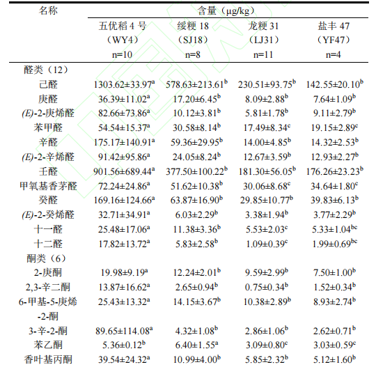 通過HS-SPME-GC-MS和快速氣相電子鼻對我國東北地區(qū)4種代表性粳米的揮發(fā)性成分及香氣組分進(jìn)行分析鑒定,除去對香氣貢獻(xiàn)較小的烷烴和雜質(zhì),GC-MS共鑒定出24種香氣成分,包括醛類12種、酮類6種、雜環(huán)類3種、烯烴類2種、酯類1種(表1);快速氣相電子鼻共檢測到82個主要峰,通過相關(guān)指數(shù)篩選和比對GC-MS數(shù)據(jù)后,共鑒定出13種香氣成分(表2),包括醛類8種、醇類2種、酮類2種、硫化物1種。通過GC-MS數(shù)據(jù)對比發(fā)現(xiàn),4種粳米香氣組成類似,醛類化合物為粳米中的主要香氣組分,這與電子鼻鑒定數(shù)據(jù)一致,其中己醛、壬醛為醛類主導(dǎo)組分,其在較低濃度時具有水果、花香、柑橘樣的香氣。另外,五優(yōu)稻4號中絕大多數(shù)香氣化合物含量均顯著(p≤0.05)高于綏粳18、龍粳31和鹽豐47。因此,五優(yōu)稻4號相比其它3種粳米香氣更加濃郁,五優(yōu)稻4號又稱稻花香2號,由五優(yōu)稻1號和黑香稻異交而來,具有宜人的香氣。