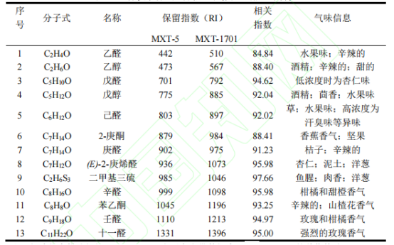 通過正構(gòu)烷烴(C6~C16)進(jìn)行校準(zhǔn),將保留時間轉(zhuǎn)化為保留指數(shù),然后通過Kovats保留指數(shù)定性,在Arochembase數(shù)據(jù)庫中對化合物進(jìn)行定性分析。