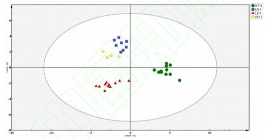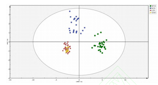 總體上看,五優(yōu)稻4號和綏粳18能進(jìn)行一定區(qū)分,龍粳31和鹽豐47區(qū)分效果較差,從香米非香米角度觀察,香米樣品和非香米樣品能較好區(qū)分,這與上述OPLS-DA模型結(jié)果一致。
