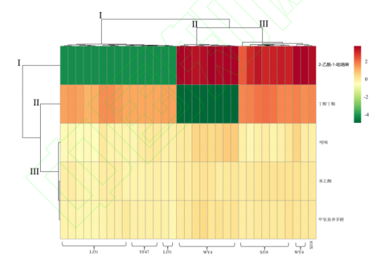 圖5 4種關(guān)鍵香氣成分含量分布熱圖