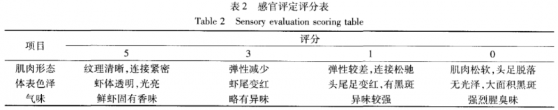 評定小組由 7 名經過一定訓練的人員組成(五女兩男),蝦的評定項目由體表色澤、氣味、肌肉形態(tài)組成,總分值在 9分(非常新鮮)和 0 分 (完全腐敗)之間,3分以下為不可接受,具體評分標準見表 2 。