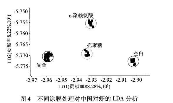 采用 PCA 和LDA 兩種方法,對不同涂膜處理的中國對蝦在同一貯藏時間下的電子鼻響應值進行分析,結果顯示,電子鼻檢測可以有效的區(qū)分四種處理方法,其中 PCA 分析所得總貢獻略高于 LDA 分析結果。