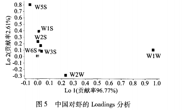 Loadings分析是對不同傳感器的貢獻率進行分析,可以用來判別電子鼻的各個傳感器的相對重要性。如果某一傳感器的響應值接近原點(0,0),則該傳感器的識別作用可以忽略不計;而當傳感器的響應值越偏離原點,則說明該傳感器的識別能力越強。圖 5為空白樣品的 Loadings 分析圖,由圖 5可知,總貢獻率為 99.38% ,其中傳感器 W 1W (無機硫化物)和 W2W (有機硫化物)對第一主成分貢獻率較大,W 5S(氮氧化合物)和的 W 1S(烴類物質)傳感器對第 2 主成分貢獻率較大,W3S(烷烴)和 W6S(氫氣)傳感器則基本接近原點,其貢獻率最小。中國對蝦在貯藏期間由于在微生物的作用,肌肉中的蛋白質、氨基酸及其它含氮物質進一步分解成氨氣、三甲胺、硫化氫、及組胺等,使蝦散發(fā)出具有腐敗特征的臭味,這與電子鼻檢測的結果相符,說明通過電子鼻技術可以有效的反映中國對蝦在貯藏過程中揮發(fā)性物質的變化。