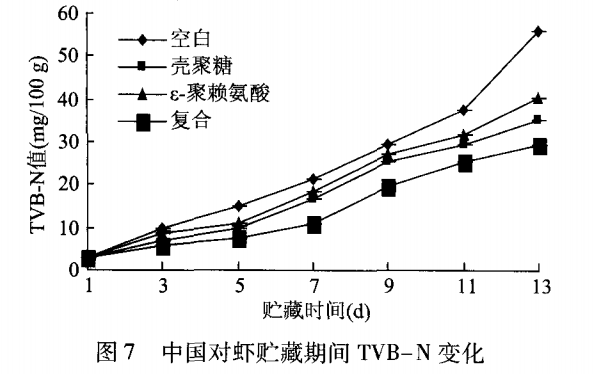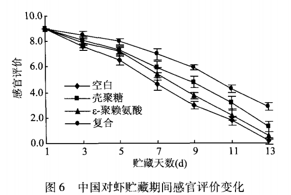 如圖 6所示,中國對蝦的感官品質在貯藏期間總體呈現下降趨勢,其中無處理的空白組下降的最明顯,在第 9d感官評分為 3,認定為完全腐敗。殼聚糖涂膜組在第 11 d徹底腐敗,經過殼聚糖涂膜處理的中國對蝦表面有一層保護膜,可以阻礙氧化反應的發(fā)生,抑制蛋白質變化,增加貯藏時間。e一聚賴氨酸處理組同樣在第 9d達到不可接受值,說明此 種處理方法在一定程度上抑制微生物的生長。與單獨涂膜處理相比,復合涂膜的效果更有利于延長貯藏時間,在第 13d感官評價值才低于不可接受值,與空白組相比延長 4 d。