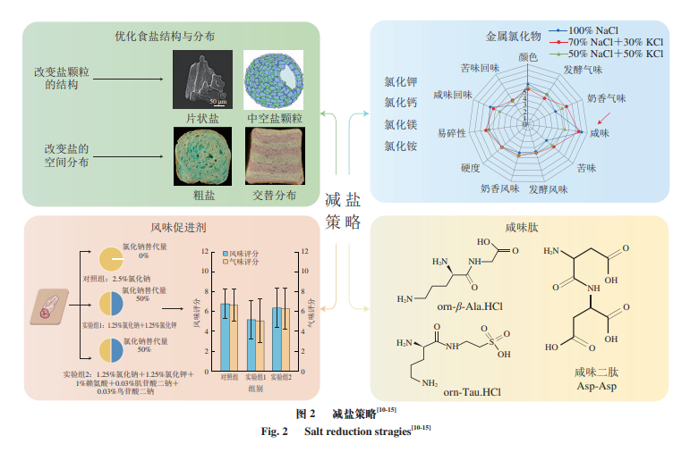 要達(dá)到“減鹽不減咸”的目的,可以基于以上咸味傳導(dǎo)途徑的特點(diǎn),從多方面、多角度減少Na+過(guò)量攝入。如通過(guò)設(shè)計(jì)食物中Na+分布等,提高咀嚼過(guò)程中Na+在口腔中的釋放速率;或者使用非Na+的金屬鹽代替NaCl作為咸味調(diào)味品;除此之外,還可使用非離子型的風(fēng)味促進(jìn)劑,如咸味香精、咸味肽等提高咸味的感知。目前常見(jiàn)的減鹽策略如圖2所示。