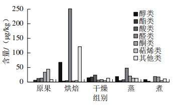 圖1表明,干燥后的揮發(fā)性物質(zhì)相對于原果都有一定幅度的減少,例如醇類、酯類、酸類、萜烯類減少是由于干燥后烯烴類遭到破壞,同時可以看到沙棗中的醛類物質(zhì)較多,尤其是在烘焙處理中含量最多,醛對棗果實的風味有顯著影響。