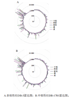 快速氣相色譜型電子產(chǎn)品鼻是基于仿生學原理,由傳感器傳感器陣列和模式識別系統(tǒng)組成,是一種新型電子分析儀器,其采用2根極性差異的色譜柱DB-5和DB-1701對氣味實現(xiàn)快速識別與解析,具備直觀簡便、重復性好等優(yōu)勢,結(jié)果見圖4。原果和干燥處理后的樣品總體出峰情況比較相似,烘焙和蒸、煮處理后的樣品在各個出峰部位的峰面積顯然放大,說明各種香氣物質(zhì)濃度含量及其總體香氣強度增加,與原果及干燥處理后相比具有一定差異。