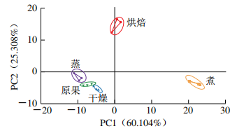主成分分析(PCA)不僅能降低原始數(shù)據(jù)的維度還可以保留分開樣本的可變性。由圖5可知,PC1、PC2的貢獻率分別為60.1%和25.3%,累計方差貢獻率為85.4%(>85%),表明其可以有效反映原始數(shù)據(jù)的整體信息。烘焙和煮處理后的沙棗樣品位于PC1的負半軸,表明這烘焙、煮2類處理方式在PC1上差異明顯。原果、蒸、干燥處理后沙棗樣品在正半軸PC2上,烘焙和其他處理的沙棗樣品得到了較好的分離,其他4種處理方式位置區(qū)域接近,結(jié)果表明這4種預處理方式相互之間或許具有一些的相似之處。各樣品組別相互離散、無交叉,說明PCA能夠?qū)⒉煌绞筋A處理后的沙棗有效的區(qū)分開。因此,可以得出各個樣品組之間可通過電子鼻區(qū)分開并相互獨立,不同處理方式可以在不同程度上改變其沙棗的香氣成分。