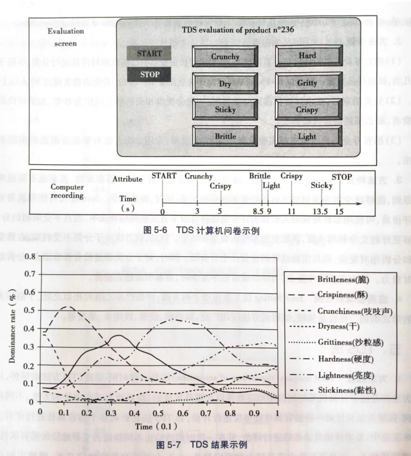 TDS(temporal dominance of sensations)法是一種時(shí)間-強(qiáng)度(TI)方法的延伸,這兩種方法都是隨著計(jì)算機(jī)系統(tǒng)的應(yīng)用而逐漸得以實(shí)現(xiàn)并發(fā)展的,均是動(dòng)態(tài)感官評(píng)價(jià)的方法,不同的是時(shí)間-強(qiáng)度方法只針對(duì)一種感官屬性的強(qiáng)度進(jìn)行評(píng)價(jià),而TDS法是針對(duì)多個(gè)感官屬性進(jìn)行評(píng)價(jià)。在TDS 實(shí)驗(yàn)中,要求評(píng)價(jià)員動(dòng)態(tài)的進(jìn)行評(píng)價(jià),并在一段時(shí)間內(nèi)給出不同階段占主導(dǎo)地位的感官屬性,主要感官屬性不一定是強(qiáng)度最大或者較大的感官屬性,關(guān)于主要感官屬性的定義有:能夠引起注意的感官屬性、持續(xù)增加并突然能被感知的感官屬性。感官專業(yè)人員通過分析實(shí)驗(yàn)結(jié)果,從而獲得不同樣品的主要感官屬性描述圖,常見的結(jié)果呈現(xiàn)方式是TDS曲線。問題和結(jié)果示意圖見圖5-6、圖5-7。