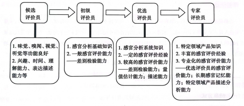 在感官評價(jià)的實(shí)踐中,往往根據(jù)不同檢驗(yàn)的要求選用不同級別的評價(jià)員,不同級別的評價(jià)員要求如下: