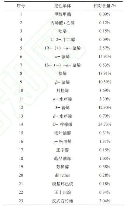 表1 胡椒精油揮發(fā)性物質(zhì)種類及相對含量