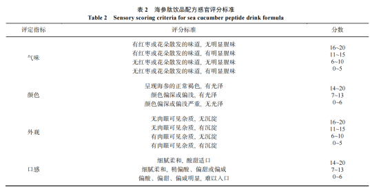 由 10 人組成感官評定小組, 分別對海參肽飲品配方的氣味、顏色、外觀、口感進行感官評定并打分, 每項分數(shù)為 20 分, 滿分為 80 分, 評分標準見表 2。