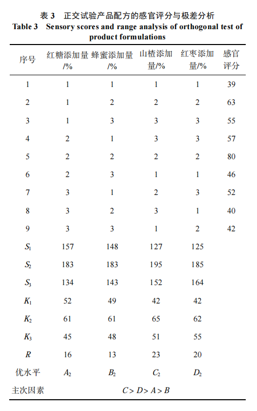 以單因素試驗為基礎, 選擇紅糖、蜂蜜、山楂、紅棗的添加量為正交試驗的 4 個因素, 采用四因素三水平 L9(34)正交試驗, 綜合產(chǎn)品的感官評分值和極差分析得到 4 個因素的最佳添加量, 正交試驗因素水平見表 1。