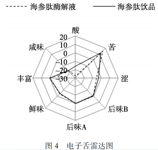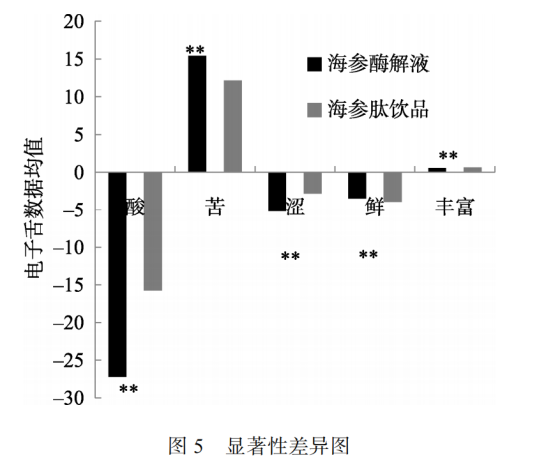 海參酶解液與海參肽飲品的電子舌檢測結果見圖 4, 結合顯著性分析(見圖 5)可以看出, 海參肽飲品與海參肽酶解液的酸味、苦味、澀味、鮮味、豐富度存在明顯差異, 其余則差異性不顯著, 引起這種現(xiàn)象的原因可能是由于海參肽飲品中加入了輔料, 其中山楂對其感官影響最大, 其次是紅糖、紅棗、蜂蜜。
