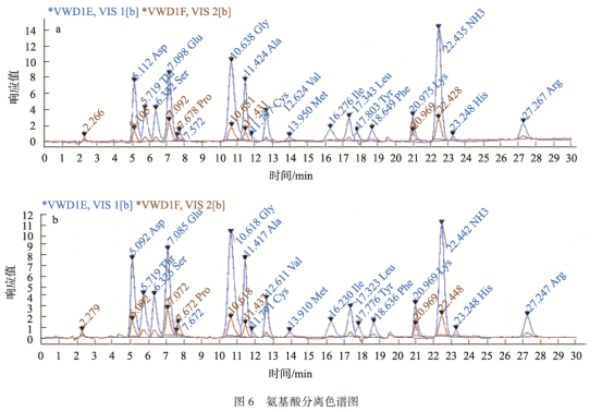 海參肽飲品氨基酸檢測結果見圖 6。圖 6a 為氨基酸混標分離色譜圖, 由圖 6a 可以看出, 氨基酸在 30 min 內(nèi)分離效果良好; 圖 6b 為海參肽飲品樣品分離色譜圖, 由圖 6b 可以看出各氨基酸出峰良好, 出峰時間與氨基酸混標出峰時間一致, 表明此方法獲得氨基酸含量準確。海參肽飲品中的 17 種氨基酸在氨基酸分析儀上獲得了較優(yōu)的分離, 在 440 nm 波長下測定脯氨酸, 570 nm 波長下測定其余氨基酸。