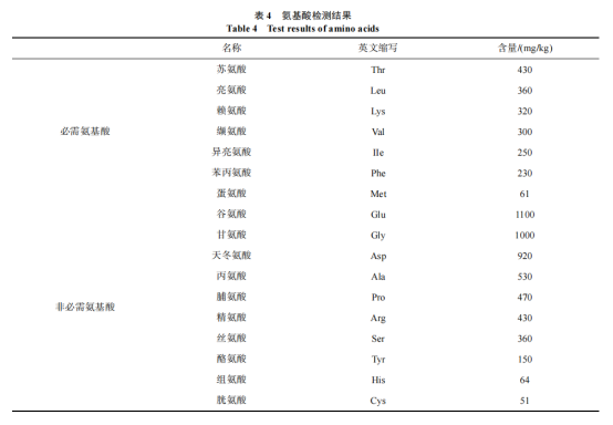 海參中含有 18 種氨基酸, 8 種為必需氨基酸, 本研究檢測了海參肽飲品中的 17 種氨基酸, 檢測結果見表 4。由表 4 可以看出, 本海參肽飲品中有 7 種必需氨基酸, 10 種非必需氨基酸, 17 種氨基酸總量為 7026 mg/kg。其中谷氨酸含量最高, 可達到 1100 mg/kg, 占氨基酸總量的 16%,谷氨酸是一種功能性氨基酸, 參與蛋白質的合成和氧化供能, 具有抗氧化能力和促進腸道發(fā)育的作用, 同時也是海參肽飲品中重要的鮮味物質。其次是甘氨酸和天冬氨酸, 含量分別占氨基酸總量的 14%和 13%。甘氨酸參與體內(nèi)多種代謝過程, 在預防酒精性肝病和免疫調(diào)節(jié)等多種方面都發(fā)揮重要作用。胱氨酸、蛋氨酸與組氨酸含量最少,占氨基酸總量的 0.7%、0.9%和 0.9%, 其余氨基酸占比范圍在 2%~8%之間。另外測得海參肽飲品蛋白質含量為7.05 mg/mL、脂肪含量為 0 mg/mL。說明此海參肽飲品含有豐富的蛋白質與多種氨基酸, 營養(yǎng)價值豐富。