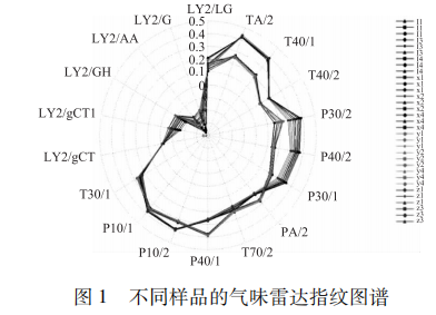 電子鼻檢測:頂空溫度45℃ , 頂空加熱時(shí)間240s;頂空注射參數(shù):采用自動(dòng)進(jìn)樣 , 注射體積1500L,注射速度500L/s,注射針總體積2.5mL;注射針溫度65℃; 獲取參數(shù): 獲取時(shí)間120s,延滯時(shí)間300s。