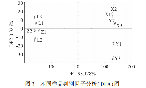 圖3中 ,實(shí)驗(yàn)設(shè)計(jì)的11組樣品響應(yīng)值被顯著地分為兩個(gè)部分 ,其判別因子1(DF1)的貢獻(xiàn)率( 權(quán)重)達(dá)到98.128% ,說明樣品之間的差異主要體現(xiàn)在橫軸上的距離 ,左半?yún)^(qū)是洋蔥粉和蒜粉對烤雞香氣的影響 ,右半?yún)^(qū)為辣椒粉和黑胡椒粉對烤雞香氣的影響,這一結(jié)果和PCA分析結(jié)果一致。其豎軸上x組和Y組之間、Z組和L組之間的差異判別因子2(DF2)的貢獻(xiàn)率( 權(quán)重)只有0.026%。