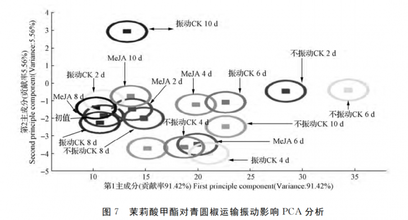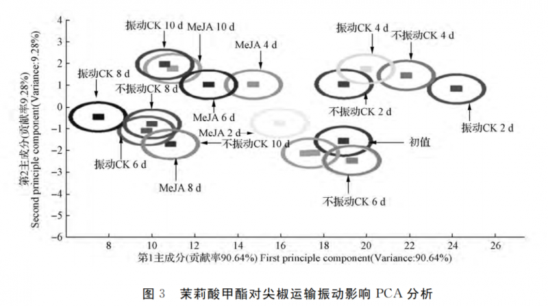 如圖7所示,為運(yùn)輸振動(dòng)清水 CK 和不振動(dòng)清水 CK 青圓椒的 PCA 分析圖(B組),其中尖椒主成分1的貢獻(xiàn)率為91.42%,主成分2的貢獻(xiàn)率為5.56%,總貢獻(xiàn)率為96.98%。表明2個(gè)主成分已經(jīng)基本代表了樣品的主要信息特征,電子鼻能夠?qū)悠泛唾A藏時(shí)間加以區(qū)分。從圖7可以看出,青圓椒振動(dòng)清水 CK 組、不振動(dòng)清水 CK 組和振動(dòng) MeJA 組在相同貯藏天數(shù)下,揮發(fā)性物質(zhì)成分區(qū)域并未重合,可以很明顯的看出,振動(dòng) MeJA 組的揮發(fā)性物質(zhì)成分區(qū)域比振動(dòng)清水 CK 組和不振動(dòng)清水 CK 組更接近初值。試驗(yàn)表明,用MeJA 處理可以有效抑制青圓椒氣味的改變,延長(zhǎng)青圓椒的貨架期,保持其新鮮度。
