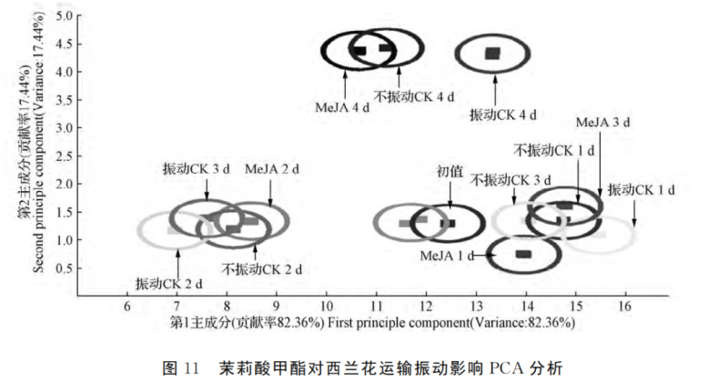 如圖11所示,清水CK 組和振動(dòng) MeJA 組(B組)的西蘭花主成分1的貢獻(xiàn)率為82.36%,主成分2的貢獻(xiàn)率為17.44%,總貢獻(xiàn)率 為99.80%。表明2個(gè)主成分已經(jīng)基本代表了樣品的主要信息特征,電子鼻能夠?qū)悠泛唾A藏時(shí)間加以區(qū)分。如圖11所示,2d后振動(dòng)清水 CK 組、不振動(dòng)清水CK 組和振動(dòng) MeJA 組的揮發(fā)性物質(zhì)成分區(qū)域遠(yuǎn)離初值,說明經(jīng)過清水浸泡的西蘭花,比未經(jīng)過清水浸泡的西蘭花更容易腐敗,貯藏2d氣味就改變較為明顯。在相同貯藏時(shí)間下,經(jīng)過 MeJA 處理的西蘭花揮發(fā)性物質(zhì)成分區(qū)域距離初值較為接近,說明,運(yùn)輸振動(dòng)后的西蘭花,經(jīng)過 MeJA 浸泡可以有效減弱西蘭花氣味的改變,提高商品價(jià)值和貯藏品質(zhì)。貯 藏4d后,西蘭花氣味改變較為明顯,此時(shí)西蘭花完全失去商品價(jià)值。