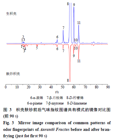將生枳殼飲片和麩炒枳殼飲片氣味指紋圖譜共有模式(由于色譜峰主要集中在前90 s內(nèi),故選擇前90 s的色譜圖)作鏡像圖,比較兩者色譜峰的數(shù)目及峰面積變化規(guī)律,尋找專屬性差異,可直觀觀察炮制前后的氣味量比關(guān)系變化情況,結(jié)果見圖3。由圖譜可知,在前10~30 s內(nèi),麩炒枳殼相比于生枳殼,色譜峰數(shù)目有增加,例如4、6號峰;在50~70 s內(nèi),麩炒枳殼相比于生枳殼,色譜峰數(shù)目幾乎無變化,但色譜峰的峰高下降明顯,例如8~10號峰;經(jīng)計(jì)算發(fā)現(xiàn),12批麩炒枳殼飲片中8號峰(β-月桂烯)峰高平均下降54.5%、9號峰(D-檸檬烯)平均下降42.4%,10號峰(γ-松油烯)平均下降46.1%,表明枳殼經(jīng)麩炒后揮發(fā)性成分含量下降明顯。與文獻(xiàn)“經(jīng)麩炒后,麥麩皮可以吸收部分揮發(fā)油,使揮發(fā)油成分降低”論述相一致[15]。