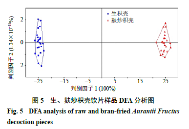 2.6.3 判別因子分析(discriminant factor analysis,DFA) DFA是在主成分分析的基礎(chǔ)上,根據(jù)某些準(zhǔn)則建立判別函數(shù),將不同組別樣本的差異擴(kuò)大,使同類樣本間差異縮小的一種具有判別分類功能的數(shù)據(jù)模型,可以用來識(shí)別和分類未知樣本[11,17]。對生、麩炒枳殼樣品的超快速氣相電子鼻數(shù)據(jù)進(jìn)行判別因子分析,結(jié)果如圖5所示,橫、縱坐標(biāo)分別表示DFA轉(zhuǎn)換得到的第1區(qū)分指數(shù)(DF1)和第2區(qū)分指數(shù)(DF2)。圖中DF1的區(qū)分指數(shù)為100%,說明DFA分析法能夠更好地從氣味角度區(qū)分生、麩炒枳殼樣品,且二者距離較遠(yuǎn),氣味明顯改變,差異較大,這也符合實(shí)際感官描述。表明氣相電子鼻可以快速鑒別生、麩炒枳殼飲片,進(jìn)一步驗(yàn)證了PCA的分析結(jié)果。