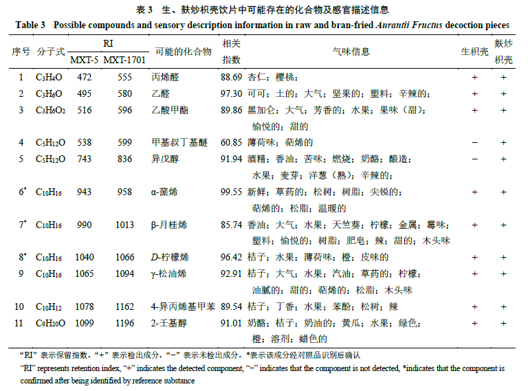 2.6.4 生、麩炒枳殼飲片氣味差異標(biāo)志物分析 將生、麩炒枳殼飲片在超快速氣相電子鼻色譜柱上采集到的色譜峰與Arochembase數(shù)據(jù)庫進(jìn)行匹配分析,結(jié)果共鑒定出11個(gè)主要?dú)馕痘瘜W(xué)成分,其中生枳殼飲片中有9個(gè)氣味化學(xué)成分,與麩炒枳殼相比,缺少甲基叔丁基醚、異戊醇2個(gè)成分。生、麩炒枳殼中可能存在的化合物及感官描述信息見表3。進(jìn)一步分析已鑒定出的可能化合物氣味信息發(fā)現(xiàn),β-月桂烯、D-檸檬烯、γ-松油烯、4-異丙烯基甲苯、2-壬基醇具有“桔子、橙、檸檬”的味道,而桔子、橙、檸檬均為蕓香科柑橘屬植物,果皮均含有豐富的揮發(fā)油,β-月桂烯、D-檸檬烯和γ-松油烯為單萜類化合物,是揮發(fā)油的組成成分,具有特殊香氣,且D-檸檬烯主要存在于柑橘類植物中[18];本研究用枳殼飲片來源于蕓香科柑橘屬植物,表明已鑒定出的成分與枳殼含有的成分有較好的一致性。