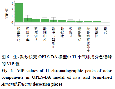 在得到生、麩炒枳殼飲片氣味成分信息的基礎(chǔ)上,為進(jìn)一步分析得出氣味差異標(biāo)志物,以11個(gè)氣味成分所對應(yīng)的色譜峰峰面積為變量,采用SIMCA 14.1軟件建立生、麩炒枳殼OPLS-DA模型,分析得到11個(gè)成分的VIP值,結(jié)果見圖6。VIP值越大,表明該成分對區(qū)分生、麩炒枳殼飲片的貢獻(xiàn)越大。由圖6可知,對區(qū)分生、麩炒枳殼飲片貢獻(xiàn)較大的前3個(gè)成分是D-檸檬烯、β-月桂烯和γ-松油烯,且這3個(gè)成分也是多數(shù)學(xué)者研究[19-20]有報(bào)道的枳殼揮發(fā)油組成成分,結(jié)合枳殼麩炒前后揮發(fā)性成分含量變化情況,初步推測這3個(gè)成分為區(qū)分生、麩炒枳殼飲片的氣味差異標(biāo)志物。