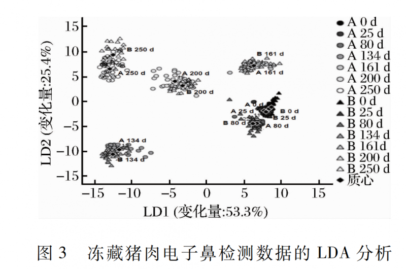 為建立相應(yīng)的預(yù)測模型,采用 LDA方法對數(shù)據(jù)進(jìn)一步分析。LDA一種常用的分類方法,立足與找到反映兩類物體或事件特征的一個線性組合,以特征化或區(qū)分不同的樣本集。對冷凍儲藏 0、25、80、134、161、200、250d共 420 個豬肉樣品數(shù)據(jù)按照分組方式和凍藏時間分為 14 個類別進(jìn)行 LDA分析,結(jié)果如圖 3所 示。用 于 作 圖 的 判 別 函 數(shù) 其 總 貢 獻(xiàn) 率 為 78.7%,其中第一判別函數(shù)貢獻(xiàn)率為 53.3%,第二判別函數(shù)貢獻(xiàn)率為 25.4%。由圖 3可知,經(jīng)過 LDA分析后,除了凍藏第 0 和 25 d的數(shù)據(jù)重合度較高外,其余第 80~250d的數(shù)據(jù)都能較好區(qū)分,說明在凍藏 1個月內(nèi)豬肉樣品的劣變幾乎沒有發(fā)生,但隨著凍藏時間的增加凍藏豬肉的變化越來越顯著。同時在第134,161,200和 250d處 A、B組樣品的組質(zhì)心分離明顯,與主成分得分的非參檢驗結(jié)果類似。