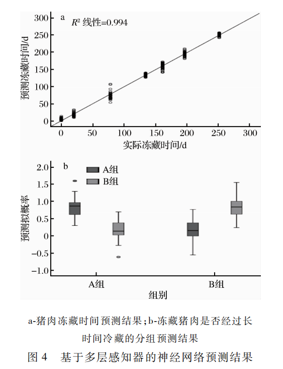 (2)線性判別分析和基于多層感知器的神經(jīng)網(wǎng)絡(luò)算法均能建立豬肉凍藏時間和凍藏前是否經(jīng)過長時間冷藏的預(yù)測模型。不過采用基于多層感知器的神經(jīng)網(wǎng)絡(luò)算法所建立的預(yù)測模型對凍藏時間預(yù)測的線性更大,回歸函數(shù)的相關(guān)性更好,對凍藏前是否經(jīng)過長時間冷藏也有更高的分組預(yù)測的準(zhǔn)確率。