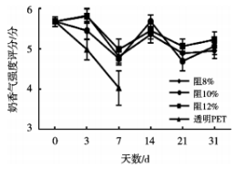 將滅菌后的鮮牛奶分別灌裝至4種PET阻隔瓶,而后將4種樣品置于光照強(qiáng)度3500-4000Lux,4-6℃儲(chǔ)存條件,分別在0,3,7,14,21和31d取樣進(jìn)行電子鼻檢測(cè)和感官品評(píng)。