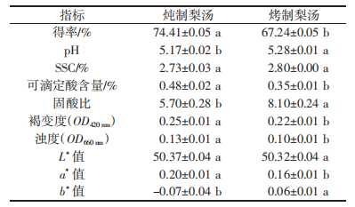 由表2可知,烤制雪花梨湯可滴定酸含量和濁度較低,pH和固酸比較高(P<0.05);燉制梨湯得率、可滴定酸含量和濁度較高,固酸比較?。≒<0.05)。兩種梨湯的SSC和L*值均無(wú)顯著性差異;色澤方面,燉制梨湯色澤較為鮮亮,烤制梨湯的褐變度和a*值較小。
