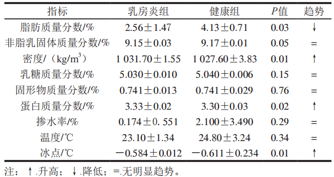 表1 乳房炎牛乳和健康乳成分含量及變化趨勢(shì)