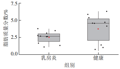如表1和圖1所示,脂肪質(zhì)量分?jǐn)?shù)、密度、蛋白質(zhì)量分?jǐn)?shù)、冰點(diǎn)4 個(gè)指標(biāo)P值均小于0.05,具有顯著差異,與健康組相比,乳房炎組牛乳脂肪質(zhì)量分?jǐn)?shù)顯著降低(P<0.05)。脂肪在體細(xì)胞數(shù)量較多的牛乳中顯著下降,可能是由于乳房發(fā)炎期間乳腺細(xì)胞合成和分泌能力下降。乳房炎牛乳中蛋白質(zhì)含量增加,可能是由于奶牛患乳房炎后會(huì)增加乳房毛細(xì)血管的通透性,從而使蛋白含量增加。其余指標(biāo)在兩種牛乳間差異不顯著(P>0.05)。