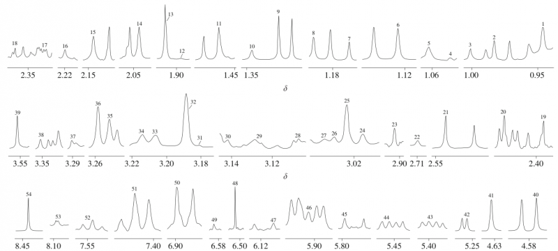 如圖4所示,利用基于H NMR的代謝組學(xué)技術(shù)從牛乳樣本中共精確定性和定量54 種分子,主要為氨基酸、有機(jī)酸、碳水化合物、核苷、核苷酸及其衍生物等化合物。