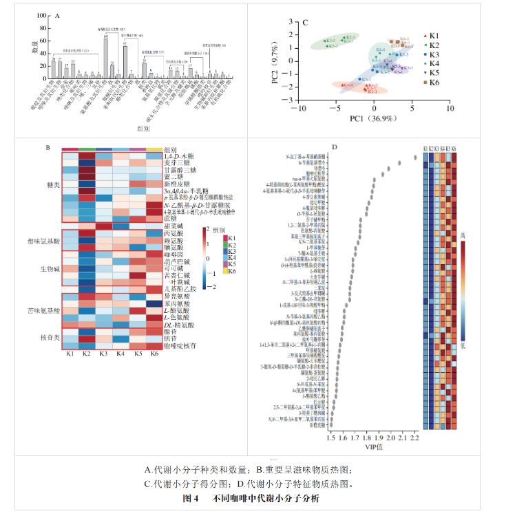 通過PLS-DA對不同咖啡代謝小分子的關(guān)系進(jìn)行綜合分析。由圖4C可知,K1、K2是淺度烘焙咖啡,在PC1的負(fù)半軸,中度、中深度烘焙咖啡在PC1的正半軸、原點(diǎn)附近,可以明顯區(qū)分。由圖4D可知,L-酪氨酸乙酯、色氨酸-丙氨酸、纈氨酸-天冬酰胺等12種氨基酸及肽類似物,巴豆酸、戟葉馬鞭草苷等5種脂類,鳥嘌呤、1-甲基腺苷等48 個化合物是引起各樣品差異的主要差異代謝物(變量投影重要性(VIP)>1.5)。區(qū)分6 種不同咖啡的烘焙度及產(chǎn)地,可直接選用部分呈滋味化合物,如胞嘧啶核苷、賴氨酸、新橙皮糖等,但更多的是與咖啡的非呈滋味代謝物有關(guān)。有研究通過超高效液相色譜串聯(lián)質(zhì)譜進(jìn)行代謝組學(xué)分析得到36 種云南小??Х扰c埃塞俄比亞咖啡的潛在標(biāo)志物,包括多酚16 種、脂質(zhì)類8 種、糖類6 種以及少量生物堿類、有機(jī)酸類、萜類。