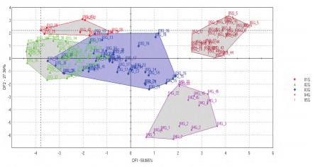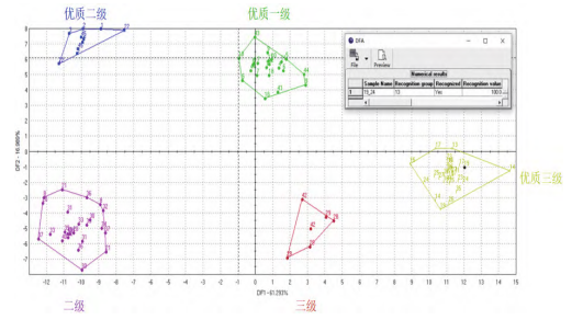 優(yōu)質(zhì)一二三級粳米對應(yīng)的品嘗評分值為90/80/70,單獨(dú)選擇優(yōu)質(zhì)一二三級樣品,并運(yùn)行DFA模型。模型圖(如圖8所示)中有部分區(qū)域重疊,說明優(yōu)質(zhì)粳米間的滋味區(qū)分不明顯。其次是國標(biāo)中的品嘗評分值是結(jié)合了氣味/外觀結(jié)構(gòu)/適口性/滋味/冷飯質(zhì)地得到的綜合結(jié)果,數(shù)據(jù)的對應(yīng)上有所偏差。
