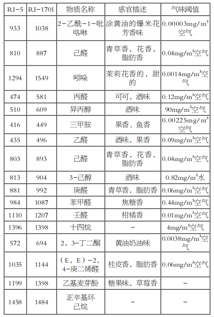 化合物的保留指數(shù)是指在某種固定相上使用正構(gòu)烷烴作為標(biāo)準(zhǔn)來衡量化合物在色譜柱上保留程度的量化值。同一種色譜柱的某一化合物的保留指數(shù)是恒定的。化合物的保留指數(shù)可經(jīng)由正構(gòu)烷烴的保留時(shí)間和化合物的保留時(shí)間計(jì)算而得到,利用兩根色譜柱不同的保留指數(shù)可達(dá)到在無標(biāo)準(zhǔn)物質(zhì)的情況下定性化合物的效果。用AroChembase數(shù)據(jù)庫對樣品中的揮發(fā)性化合物(差異色譜峰)進(jìn)行定性,可能含有的化合物見表2所示。閾值的大小代表了物質(zhì)氣味的強(qiáng)弱,相同含量的兩種物質(zhì),閾值越低則氣味越強(qiáng)。