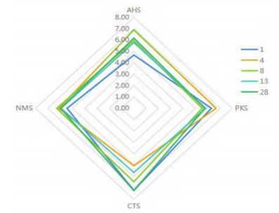 每個(gè)稻米樣品6次平行,計(jì)算各等級樣品AHS(酸味)、PKS(通用)、CTS(咸味)、NMS(鮮味)等4個(gè)味覺傳感器得分的平均值,得到雷達(dá)圖(如圖6所示)。不同等級稻米樣品對應(yīng)4個(gè)傳感器的得分離散程度較大,表明4種傳感器可以較好的區(qū)分不同等級的稻米樣品。其中優(yōu)質(zhì)一級(分組4)AHS、PKS得分最高,NMS、CTS最小,三級(分組28)CTS得分最高。