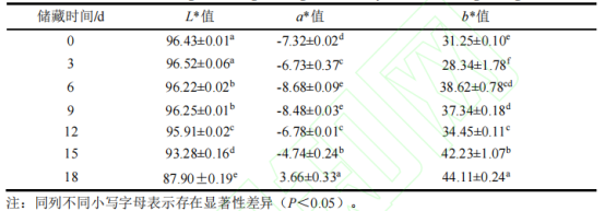 漿水青稞奶茶貯藏過程中色澤變化情況可通過L*值、a*值、b*值來衡量,L*值表示亮度,a*值表示紅綠度,b*值表示黃藍(lán)度。漿水青稞奶茶4℃貯藏過程中色度變化如表2所示。
